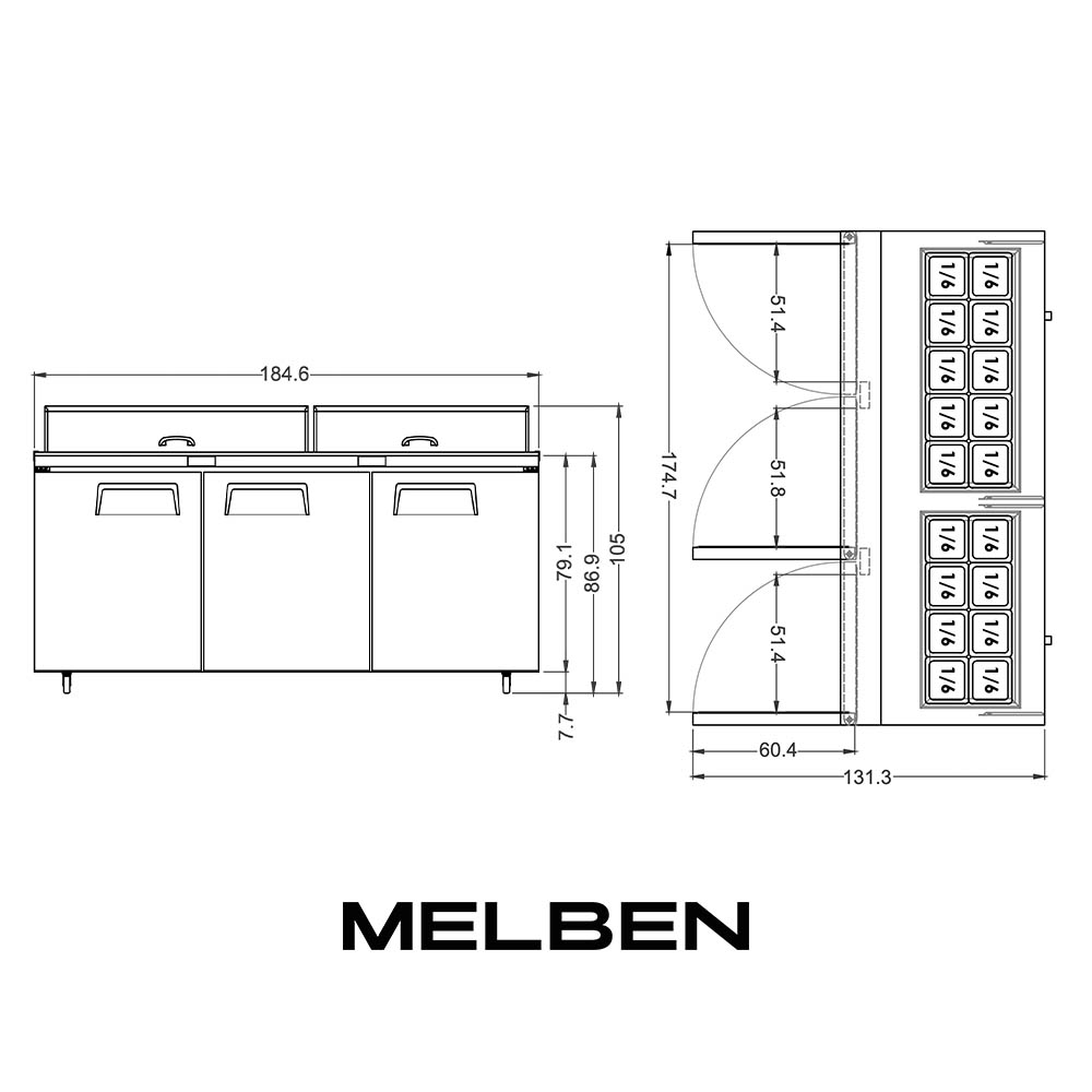 Mesón Saladette 3 Puertas Acero 598L MSF8304-MSALD72″